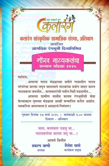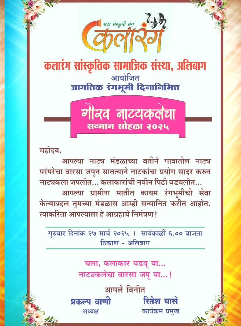 अलिबाग दिनांक जागतिक रंगभूमी दिनानिमित्त क ला रंग संस्थेच्या वतीने “ गौरव नाट्यकलेचा “ सन्मान सोहळा 2025 चे आयोजन करण्यात आले… या मध्ये गावा गावात नाटक करणार्या नाटक मंडळाना सन्मानित करण्यात आले असून… गावातील नाट्य परंपरा या विचारावर चर्चा सत्र घेण्यात आले… गावातील नाटक कलाकार यांनी भरघोस प्रतिसाद दिला..